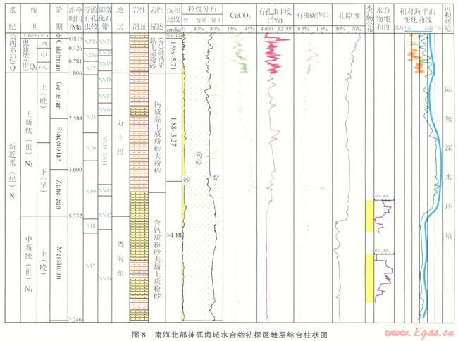 南海北部陸坡水合物主要富集在晚中新世以來(lái)的海相沉積物中,分布深度和層位深淺不一。通過(guò)對(duì)神狐鉆孔巖心分析,根據(jù)生物地層帶對(duì)比劃分標(biāo)準(zhǔn)[25],水合物層分布在NNl2-NNl6和NNll帶,分別對(duì)應(yīng)為上新統(tǒng)下部和上中新統(tǒng)(圖8)。從區(qū)域性沉積相分析,晚中新世以來(lái)南海北部陸坡區(qū)沉積演化具有明顯的繼承性,早期為濱海淺海深海的沉積環(huán)境,后期主要為半深海和深海沉積環(huán)境,陸坡沉積物總體巖性偏細(xì)。但是在臺(tái)西南盆地、珠江口盆地白云凹陷以及瓊東南盆地,局部發(fā)育了等深流、濁積扇、滑塌沉積、陸坡水道等沉積體系,由于沉積速率高、沉積物偏粗、有機(jī)碳含量較高,有利于水合物富集成藏(圖9)。