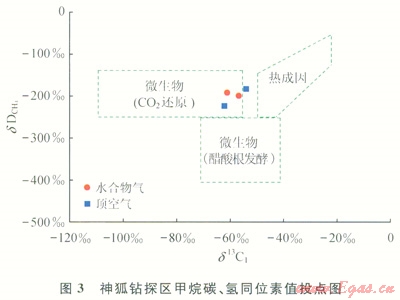 天然氣水合物氣體成因、來(lái)源及供給潛力是水合物成藏研究的最基本問(wèn)題,它決定著水合物形成的物質(zhì)基礎(chǔ)及礦藏的資源潛力。深部的熱成因氣以及由水合物穩(wěn)定帶下部向上運(yùn)移的生物氣對(duì)于形成水合物是必需的[10],不同成因類(lèi)型的烴類(lèi)氣體具有不同的形成機(jī)理和運(yùn)聚方式,并影響水合物的成藏和分布。目前世界各地發(fā)現(xiàn)的水合物大多數(shù)由微生物氣生成,僅墨西哥灣、黑海、麥肯齊三角洲等地區(qū)的水合物是由熱解氣或混合氣生成的。因此,生物成因氣在水合物成藏研究中得到了較大的關(guān)注。由于頂空氣代表充填在沉積物孔隙或裂隙中的游離氣,與水合物礦藏氣體的成因關(guān)系密切,近年對(duì)南海北部陸坡大量淺表層沉積物(海底以下0~10m)中頂空氣的測(cè)試分析結(jié)果表明,頂空氣中的d13C1值介于-102.6‰~-24.0‰,平均值為-71.1‰,C1/(C2+C3)值介于6~84659,dD值介于-180‰~145‰,研究表明氣體來(lái)源具有多源性,而且在不同區(qū)域有所差別。東沙海域頂空氣的d13C1值為-102.6‰~-38.2‰,平均值為-78.5‰,是以微生物氣為主的混合氣;西沙海域頂空氣d13C1值為-94.2‰~-71.4‰,平均值為-85.5‰,為微生物氣。從神狐鉆探區(qū)情況看,水合物樣品中的烴類(lèi)氣體以甲烷為主,甲烷含量高達(dá)99.89%和99.91%,C1/(C2+C3)值分別為911.7和1094,d13C1值為-56.7‰和-60.9‰,dD值為-199﹪和-180‰;2個(gè)頂空氣樣品的甲烷含量分別達(dá)99.92%和99.96%,C1/(C2+C1)值分別為1373.5和2447,d13C1值為-62.2‰和-54.1‰,dD值為-225‰和-191‰。神狐鉆探區(qū)呈現(xiàn)以微生物氣為主的混合氣特征[11-12],根據(jù)甲烷碳、氫同位素特征分析,主要為C0。還原型甲烷(圖3),水合物具有自生自儲(chǔ)原地附近運(yùn)聚的成藏特征[13]。