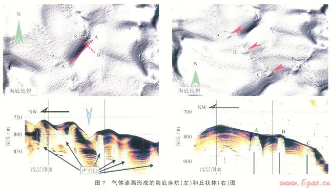 氣煙囪作為超壓流體泄壓的通道,將大量氣體運(yùn)移到淺部穩(wěn)定域中形成水合物礦藏,部分天然氣滲漏導(dǎo)致在海底形成冷泉噴口、麻坑、匠狀體、碳酸鹽巖匠等并引起海底微地貌的變化,在其周?chē)植加写罅咳缇?、蠕蟲(chóng)類(lèi)、雙殼類(lèi)等組成的以溢出天然氣為營(yíng)養(yǎng)源的生物組合。例如,在南海東北部陸坡廣泛發(fā)育海底麻坑、丘狀體、自生碳酸鹽巖結(jié)殼等微地貌標(biāo)志(圖7),表明該區(qū)存在著大規(guī)模的海底滲漏現(xiàn)象。2004年中德合作SO177航次在該海域也發(fā)現(xiàn)了大量的結(jié)核狀、結(jié)殼狀或管狀白生碳酸巖鹽和典型的化能生物群落(雙殼類(lèi)生物和管狀蠕蟲(chóng)類(lèi)及厭氧菌席)。
