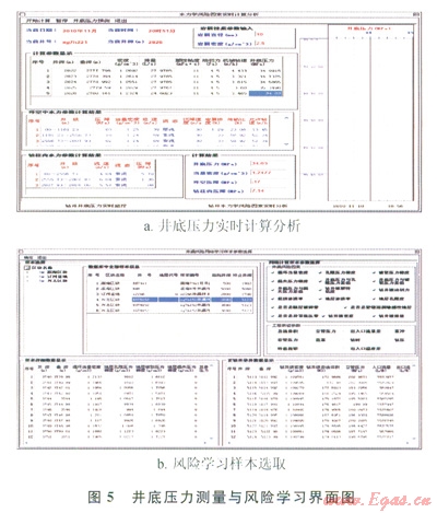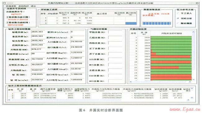 在我國(guó)某油田鉆井時(shí),應(yīng)用鉆井風(fēng)險(xiǎn)控制系統(tǒng)實(shí)時(shí)診斷鉆井狀態(tài),分別對(duì)鉆井實(shí)時(shí)數(shù)據(jù)采集軟件、鉆井實(shí)時(shí)數(shù)據(jù)庫(kù)管理軟件、鉆井風(fēng)險(xiǎn)因素實(shí)時(shí)計(jì)算分析軟件和鉆井風(fēng)險(xiǎn)推理風(fēng)險(xiǎn)軟件進(jìn)行現(xiàn)場(chǎng)測(cè)試(圖5、6)。以采集的鉆井實(shí)時(shí)數(shù)據(jù)為基礎(chǔ),應(yīng)用鉆井風(fēng)險(xiǎn)因素實(shí)時(shí)分析軟件計(jì)算井底壓力和地層壓力等參數(shù),以鄰井資料作為井漏風(fēng)險(xiǎn)學(xué)習(xí)的樣本,判斷該井井漏風(fēng)險(xiǎn),系統(tǒng)判斷該井在鉆至2823m時(shí)井漏風(fēng)險(xiǎn)可能性較大,當(dāng)鉆進(jìn)至2825m時(shí)技術(shù)人員發(fā)現(xiàn)井底發(fā)生漏失,決定進(jìn)行起鉆堵漏作業(yè)?,F(xiàn)場(chǎng)測(cè)試表明鉆井風(fēng)險(xiǎn)控制系統(tǒng)的數(shù)據(jù)采集軟件與儀器測(cè)量?jī)x器同步性好,數(shù)據(jù)庫(kù)設(shè)計(jì)合理,且井漏風(fēng)險(xiǎn)實(shí)時(shí)診斷預(yù)測(cè)結(jié)果與現(xiàn)場(chǎng)完全吻合。