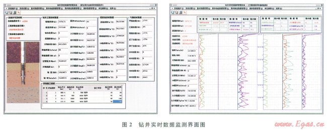 3)建立了以國(guó)際通用WITS標(biāo)準(zhǔn)為參考依據(jù)的鉆井風(fēng)險(xiǎn)控制系統(tǒng)數(shù)據(jù)庫(kù),并優(yōu)化了數(shù)據(jù)庫(kù)結(jié)構(gòu)及查詢模式,開(kāi)發(fā)了鉆井風(fēng)險(xiǎn)控制系統(tǒng)實(shí)時(shí)數(shù)據(jù)庫(kù)管理軟件。軟件為用戶提供了數(shù)據(jù)庫(kù)備份、數(shù)據(jù)庫(kù)還原功能;可以瀏覽、修改、查詢、導(dǎo)出、導(dǎo)入、刪除、整理任意井的鉆井?dāng)?shù)據(jù);可以對(duì)各種數(shù)據(jù)進(jìn)行實(shí)時(shí)顯示、按時(shí)間回放、按井深回放;可以將任意數(shù)據(jù)導(dǎo)出到文本文件中;可以進(jìn)行異地備份;可以按用戶需要導(dǎo)入相關(guān)數(shù)據(jù),鉆井實(shí)時(shí)數(shù)據(jù)監(jiān)測(cè)界面如圖2所示。