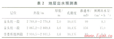 鉆至2900m(2870m進(jìn)入登婁庫(kù)組四段),扭矩開始發(fā)牛波動(dòng),預(yù)計(jì)鉆達(dá)第3個(gè)水層(表2)。2914m接立柱后恢復(fù)鉆進(jìn)時(shí)返出氣體潮濕,判斷接換立柱時(shí)井下已經(jīng)出水。循環(huán)30min后粉塵返出,現(xiàn)場(chǎng)繼續(xù)采用氣體鉆井,鉆時(shí)3~15min/m。