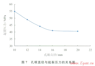 根據(jù)裂縫起裂壓力與射孔孔徑的關(guān)系(圖7) [7],裂縫起裂(破裂)壓力隨孔眼直徑的增加呈下降趨勢。因此,射孔時(shí)應(yīng)盡可能選擇較大直徑的射孔彈進(jìn)行射孔。但在相同的射孑L條件下,射孔孔徑越大,則射孔深度越小,為了兼顧射孔孔眼深度,元壩陸相井目的層射孔孔眼直徑多選擇在12~16mm范圍。