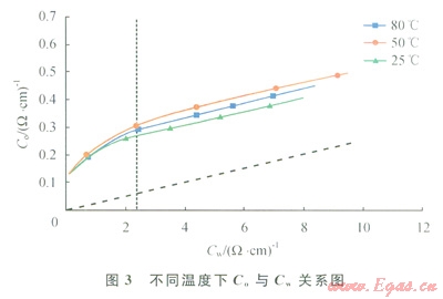 圖3中虛斜線為純水砂巖在25℃實驗條件下的關(guān)系曲線,從圖3中可以看出,在淡的平衡溶液部分(Cw在0~2.5之間),泥質(zhì)砂巖的電導(dǎo)率(Co)將隨溶液電導(dǎo)率(Cw)的增加急劇增大,Co增加的速度遠(yuǎn)大于Cw增加的速度,當(dāng)溶液電導(dǎo)率(Cw)進(jìn)一步增加的時候,泥質(zhì)砂巖的電導(dǎo)率(Co)將隨溶液電導(dǎo)率(Cw)的增加呈線性增加,即當(dāng)溶液電導(dǎo)率(Cw)大于2.5(W·cm)-1時,此時Co—Cw的曲線呈線性關(guān)系。根據(jù)W&S模型,在常溫(25℃)下,當(dāng)溶液礦化度超過一定濃度時,陽離子附加電導(dǎo)B值將趨于一個非常有限的極值。礦化度越高,水溶液電導(dǎo)率(Cw)就越大,附加電導(dǎo)分量(BQv)與溶液電導(dǎo)(Cw)相比對總的電導(dǎo)貢獻(xiàn)就越小。因此當(dāng)?shù)貙铀V化度很高時,黏土附加電導(dǎo)作用是完全可以忽略的。