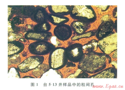 微觀孔隙的大小及其分布特征決定了束縛水飽和度的高低,同時,由于親水性強的黏土礦物的填充進(jìn)一步改造了粒間孔隙,造成微孔隙的增加,巖石內(nèi)比面的增大,薄膜滯水增多,含水飽和度增加。臺南氣田儲層孔隙類以原生孔隙為主,僅有少量的次生孔隙。原生孔隙主要為原生粒間孔,其次為雜基內(nèi)微孔;次生孔隙主要為溶孔,有少量裂縫發(fā)育。通過臺5-x3及臺試x5井鑄體薄片(圖1)對孔隙類型的統(tǒng)計表明,發(fā)現(xiàn)孔隙結(jié)構(gòu)中84.78%為粒間孔,13.04%為微裂縫;喉道類型以縮頸型喉道為主,少量微喉道,孔徑分布一般在0.1~1mm之間,面孔率在1%~15%之間。分析表明,臺試5井孔隙以粒間孔為主,孔隙半徑比較細(xì),微孔隙比較發(fā)育,發(fā)育少量微裂縫。