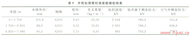 考慮到井筒條件,只能采用Gl05鋼級的Æ101.6mm、Æ88.9mm、Æ73.0mm/Æ60.3mm新鉆桿進(jìn)行通井作業(yè)。其參數(shù)及強(qiáng)度校核如表5所示。