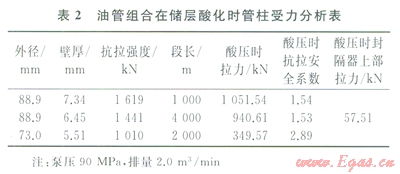 根據(jù)抗管柱在酸壓、生產(chǎn)過程中的強(qiáng)度校核,最大限度地降低生產(chǎn)成本,油管柱選擇125鋼級Æ88.9mm×7.34mm+Æ88.9mm×6.45mm+Æ73mm×5.51mm復(fù)合油管。