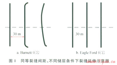 隨著工具設(shè)備及水平井改造技術(shù)的不斷進(jìn)步,儲(chǔ)層多段改造的規(guī)模、段數(shù)等越來(lái)越多[8-9]。水力壓裂沒計(jì)師可利用分簇射孔將分段改造距離設(shè)置得越來(lái)越近,但往往過多的分簇與分段未必就帶來(lái)理想的效果,Roussel認(rèn)為應(yīng)力陰影效應(yīng)的產(chǎn)生機(jī)理主要在于支撐劑的填充導(dǎo)致人工裂縫附近引起了應(yīng)力場(chǎng)的變化,蔣廷學(xué)等也在研究我國(guó)頁(yè)巖氣壓裂設(shè)計(jì)中指出,壓裂在單一裂縫脆弱面上產(chǎn)生誘導(dǎo)應(yīng)力的存在,并指出產(chǎn)生應(yīng)力陰影的誘導(dǎo)應(yīng)力可以改變最大與最小主應(yīng)力的分布,使裂縫發(fā)生轉(zhuǎn)向[10]。述研究表明,應(yīng)力陰影效應(yīng)可引起人工裂縫從水平井的橫切縫中開始偏離朝向或遠(yuǎn)離以前的裂縫方向延伸,使得下一裂縫發(fā)生轉(zhuǎn)向。Barnctt頁(yè)巖裂縫間距30m時(shí)水平井壓裂裂縫產(chǎn)生的應(yīng)力陰影效應(yīng)如圖1-a所示,可見從第二條裂縫開始裂縫出現(xiàn)了與主縫向切的裂縫系統(tǒng),而Eagle Ford頁(yè)巖壓裂的裂縫監(jiān)測(cè)情況,同樣是30m的裂縫間距沒有出現(xiàn)裂縫應(yīng)力陰影效應(yīng)(圖1-b)。因此研究陰影效應(yīng)的產(chǎn)生機(jī)理,建立分析數(shù)學(xué)模型并進(jìn)行其影響因素分析對(duì)水平井分段體積改造優(yōu)化設(shè)計(jì)及效果的提升具有重要研究與應(yīng)用價(jià)值。