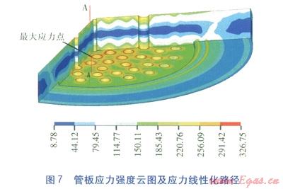 應(yīng)力線性化是ANSYS軟件對(duì)運(yùn)算結(jié)果進(jìn)行后處理以讀取計(jì)算數(shù)據(jù)的方法。應(yīng)力線性化路徑的選取原則是:通過(guò)應(yīng)力強(qiáng)度最大位置處的節(jié)點(diǎn),并以最短距離橫穿構(gòu)件壁的方向設(shè)定應(yīng)力線性化路徑[4]。軟件系統(tǒng)則在路徑上通過(guò)內(nèi)插法自動(dòng)生成插值點(diǎn),并把計(jì)算結(jié)果映射到路徑上。軟件會(huì)自動(dòng)對(duì)計(jì)算結(jié)果進(jìn)行應(yīng)力分類,并顯示相應(yīng)路徑下的各類計(jì)算應(yīng)力值?;诒?span lang="EN-US">2強(qiáng)度計(jì)算所需載荷數(shù)據(jù),通過(guò)軟件計(jì)算,得到管板應(yīng)力強(qiáng)度分布及應(yīng)力線性化路徑,見圖6、7,圖中數(shù)值為應(yīng)力強(qiáng)度,單位為MPa。