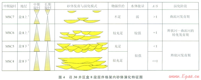 LSC2即盒8段上部層序由2個中期旋回(MSC3~MSC4)組成,底部旋回(MSC3)為向上變“深”的非對稱型,該中期旋回由2~3個(SSC7~SSC9)短期旋回組成,短期旋回由A型(向上“變深”非對稱型)向C型(對稱型)過渡,表明基準面有所抬升,可容納空間增大;頂部旋回(MSC4)為以上升半旋回為主的不完全對稱型,此時源區(qū)構造相對穩(wěn)定,物源供給量相對減少,基準面抬升,可容納空間增大,A/S值大于1,該中期旋回由2~3個短期旋回組成(SSCl0~SSCl2)。