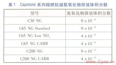 微燃機(jī)組的基本工作原理是空氣經(jīng)壓縮機(jī)增壓后與天然氣在燃燒室內(nèi)燃燒,產(chǎn)生的高溫高壓煙氣推動(dòng)透平做功帶動(dòng)發(fā)電機(jī)發(fā)電。作為最早研發(fā)也是目前最成功的微燃機(jī)組之一——Capstone系列微燃機(jī)組,集透平、高效回?zé)崞?、空氣軸承、高速永磁發(fā)電、超低排放、高度集成的數(shù)字電力轉(zhuǎn)換技術(shù)于一體。該系列微燃機(jī)組只有一個(gè)運(yùn)動(dòng)部件,結(jié)構(gòu)緊湊,采用空氣冷卻,無需潤(rùn)滑油及冷卻液,運(yùn)行維護(hù)費(fèi)用低,燃料適應(yīng)性強(qiáng),可實(shí)現(xiàn)模塊化組裝,煙氣余熱具有較高的利用價(jià)值。由于采用稀薄燃燒技術(shù),使得氮氧化物排放體積分?jǐn)?shù)低于9×10-6,可滿足嚴(yán)格的環(huán)保要求,無需進(jìn)行脫硝處理。Capstone系列微燃機(jī)組氮氧化物排放體積分?jǐn)?shù)見表1。