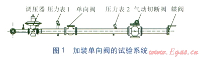 當用戶用氣設備突然停機,會造成調(diào)壓器出口管段內(nèi)壓力瞬間升高,其原因主要是用氣設備的切斷速度極快(切斷時間小于1s),而調(diào)壓器的閥口關閉速度慢(需3~4s),調(diào)壓器閥口關閉的響應時間比用戶用氣設備切斷閥的切斷時間長,造成用戶用氣設備切斷后,調(diào)壓器上游還有少量氣體輸送至下游,造成下游管段壓力瞬間升高。如何抑制調(diào)壓器出口壓力的突然上升?本文從在調(diào)壓器出口管段上加裝單向閥、加裝安全放散閥以及調(diào)整用戶端用氣設備控制閥門的關閉程序等3個方面進行試驗研究。