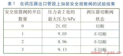試驗方法:調(diào)壓器進口壓力設定為0.4MPa,出口壓力設定為7kPa,調(diào)壓器切斷閥的切斷壓力設定為9.8kPa,安全放散閥開啟壓力為8.4kPa。對不開啟安全放散閥、開啟l個安全放散閥、開啟2個安全放散閥及開啟3個安全放散閥這3種工況進行試驗,觀察壓力表2的讀數(shù),試驗結果見表1。