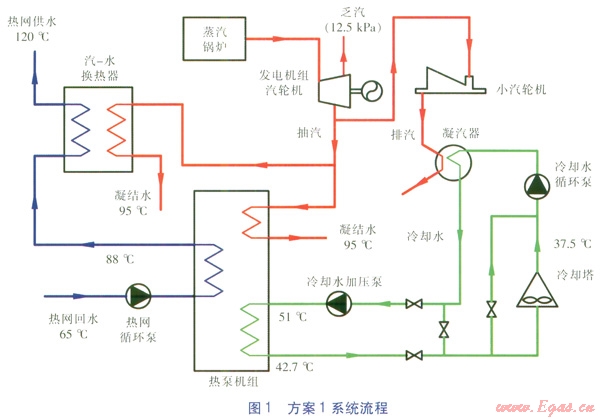 發(fā)電機(jī)組汽輪機(jī)抽汽作為熱泵機(jī)組驅(qū)動(dòng)蒸汽,低溫?zé)嵩礊樾∑啓C(jī)凝汽器冷卻水余熱。方案1的系統(tǒng)流程見圖1。系統(tǒng)流程可分為3個(gè)分項(xiàng)流程:a.熱網(wǎng)循環(huán)水流程:熱網(wǎng)回水65℃,經(jīng)熱泵機(jī)組加熱至88℃后,進(jìn)入汽—水換熱器加熱至l20℃作為熱網(wǎng)供水。b.發(fā)電機(jī)組汽輪機(jī)抽汽流程:不考慮小汽輪機(jī)用汽,發(fā)電機(jī)組汽輪機(jī)抽汽分為兩部分,一部分作為熱泵機(jī)組驅(qū)動(dòng)蒸汽,另一部分進(jìn)入汽—水換熱器加熱熱網(wǎng)回水,兩部分凝結(jié)水溫度均為95℃,并由汽動(dòng)給水泵加壓輸送回蒸汽鍋爐。c.凝汽器冷卻水流程:小汽輪機(jī)凝汽器出口冷卻水溫度為51℃,作為熱泵機(jī)組低溫?zé)嵩?,余熱利用后溫度降?span lang="EN-US">42.7℃,經(jīng)冷卻塔進(jìn)一步降溫后(冷卻塔出水溫度為37.5℃)進(jìn)入凝汽器。