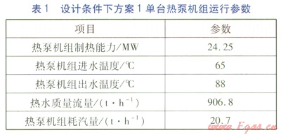 方案1的運(yùn)行策略為:初末寒期采用熱泵機(jī)組單獨(dú)供熱,汽—水換熱器不啟動(dòng),當(dāng)熱泵機(jī)組出水溫度不能滿足要求時(shí),啟動(dòng)汽—水換熱器對(duì)熱泵機(jī)組出水進(jìn)行加熱。配置4臺(tái)制熱能力為24.25MW的熱泵機(jī)組,3臺(tái)換熱能力為45MW的汽—水換熱器。設(shè)計(jì)條件下(室外溫度為-22℃),方案1單臺(tái)熱泵機(jī)組運(yùn)行參數(shù)見表1。