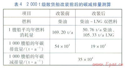 根據(jù)國(guó)家發(fā)改委提供的能源碳排放量計(jì)算方法,LNG與燃油的碳排放強(qiáng)度系數(shù)分別為0.27和3.18,即每消耗1kg LNG產(chǎn)生0.27kg的CO2,每消耗1kg燃油產(chǎn)生3.18kg的CO2,據(jù)此對(duì)2000t級(jí)散貨船改裝前后的碳減排量進(jìn)行測(cè)算比較,見表4。