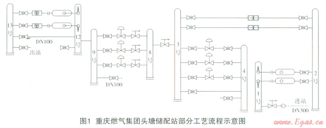 利用前面介紹的方法,對(duì)重慶燃?xì)饧瘓F(tuán)股份有限公司某儲(chǔ)配站進(jìn)行計(jì)算,該儲(chǔ)配站部分工藝流程示意圖見圖1。
