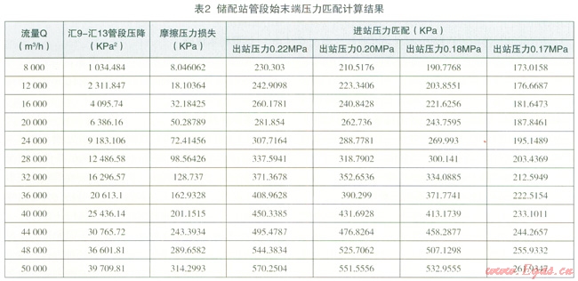 通過計(jì)算得到儲(chǔ)配站在不同流量下進(jìn)、出站壓力匹配計(jì)算結(jié)果見表2。