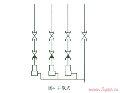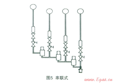 目前國產(chǎn)的優(yōu)先順序控制盤分為并聯(lián)式(見圖4)和串聯(lián)式(見圖5)兩種,均設高、中、低壓和直充功能,其核心部件也就是壓力保持閥和止回閥。串并聯(lián)的優(yōu)先順序控制盤均經(jīng)過壓力保持閥和止回閥改造實現(xiàn)儲氣井的天然氣回收。其不同的是,并聯(lián)式優(yōu)先順序控制盤在回收儲氣井(瓶)中的天然氣時可以對高、中和低壓其中之一進行回收,互不影響,操作簡單、方便;而串聯(lián)式則在回收任何一個儲氣井(瓶)時要對高、中和低壓三組壓力保持閥和止回閥同時進行改造,相對就麻煩一些。