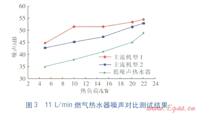 由圖3可知,當(dāng)熱負(fù)荷在18kW以下時,11L/min的低噪聲熱水器的噪聲比主流機(jī)型低7dB以上;最大熱負(fù)荷時,低4dB以上。