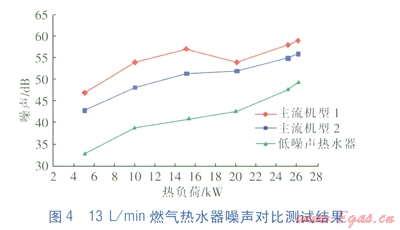 由圖4可知,當(dāng)熱負(fù)荷在21kW以下時,l3L/min的低噪聲熱水器的噪聲比主流機(jī)型低10dB以上;最大熱負(fù)荷時,低6dB以上。