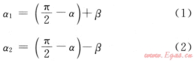 鉆井井斜角為α(α<90°)、地層的傾角為β、井眼軌跡方向與地層的走向相反和相同時(shí),它們與地層的夾角分別為α1、α2,其計(jì)算公式分別為: