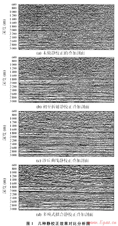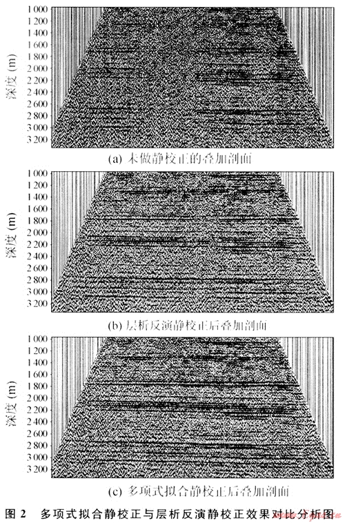 圖1為實際處理塔中某工區(qū)地震資料的幾種靜校正方法對比。從對比結果可以看出,多項式擬合求取表層速度的靜校正方法基本上消除了長短波長靜校正問題。應該指出的是:由于沙漠地區(qū)的地下水含鹽分較高,沙漠低洼處表層板結嚴重,沙質致密,因而低洼處表層速度較高,用同樣厚度的疏松沙質的速度與同厚度的板結沙質的速度放在一起統(tǒng)計會帶來較大誤差,實際應用時分層統(tǒng)計效果較好。