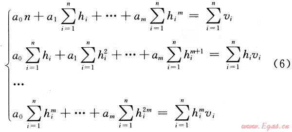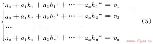 必須做的是要確定其中的系數a0,a1,…,am。將n對數據(vi,hi)代入式(4),就得到一個具有m+1個未知數ai的n個方程的矛盾方程組: