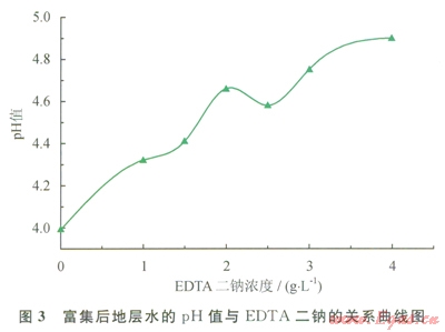 在對(duì)地層水中的發(fā)酵產(chǎn)氫菌富集后,各地層水菌液的pH值隨著培養(yǎng)基中EDTA二鈉濃度的增加呈現(xiàn)逐漸增大的趨勢(shì)(圖3)。這說(shuō)明EDTA二鈉具有延緩菌液的pH值降低的作用。但是EDTA二鈉本身含有4個(gè)羧基,其溶于水后顯酸性,且EDTA二鈉的性質(zhì)穩(wěn)定,在酸性條件下不具有生物可降解性[15-17],這就排除了EDTA二鈉本身的影響。