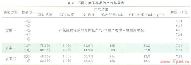 產(chǎn)氫廢料的產(chǎn)甲烷反應(yīng)啟動(dòng)較慢,大約在第35天才開(kāi)始有氣體產(chǎn)生,且產(chǎn)氣速率遠(yuǎn)比產(chǎn)氫階段要慢,持續(xù)時(shí)間較長(zhǎng),直到第55天后才停止產(chǎn)氣。第65天測(cè)試各個(gè)集氣瓶中的氣體組分(表4)。所有樣品中均未檢測(cè)到氫氣。