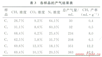 單獨(dú)發(fā)酵產(chǎn)甲烷工藝大約在第15天后才開(kāi)始有甲烷產(chǎn)生,產(chǎn)氣持續(xù)時(shí)間約為30d,本實(shí)驗(yàn)于第35d測(cè)試各樣品的產(chǎn)氣結(jié)果(表3)。