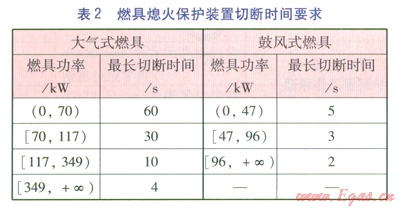 在工程實踐中,要求在燃具的每個燃燒器上都設(shè)置獨立的熄火保護(hù)裝置。另外,熄火保護(hù)裝置從檢測到?jīng)]有火焰到給出有效信號切斷燃?xì)夤?yīng)的整個操作過程必須是在安全合理的時間內(nèi),因為此操作過程時間過長,燃具泄漏的燃?xì)膺^多,危險性過高,保護(hù)裝置就失去了意義。對于不同類型及功率燃具的熄火保護(hù)裝置的最長切斷時間,澳門地區(qū)的相關(guān)燃?xì)夥ㄒ?guī)要求見表2。