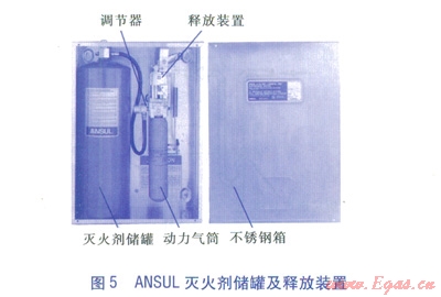②調(diào)節(jié)型釋放裝置。屬于一種裝有彈簧的機(jī)械、氣動釋放裝置,配置一個儲存二氧化碳或氮氣的動力氣筒,向滅火劑儲罐提供動力氣供應(yīng),氣筒上安裝有調(diào)節(jié)器,氣筒的密封層設(shè)計成由釋放裝置擊穿。釋放裝置由熔線探測系統(tǒng)進(jìn)行自動啟動,釋放裝置還可以通過鋼絲繩索連接設(shè)置在保護(hù)區(qū)以外的機(jī)械按鈕進(jìn)行遙控手動開啟,另外可與大廈中央監(jiān)控系統(tǒng)的連接線兼容,將有關(guān)信號自動傳輸?shù)酱髲B中央監(jiān)控系統(tǒng)。ANSUL滅火劑儲罐及釋放裝置見圖5。