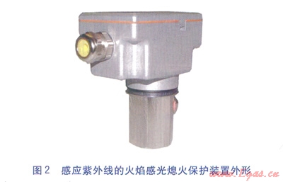 火焰感光熄火保護(hù)裝置利用火焰的光特性,采用感光式電子火焰?zhèn)鞲衅?,吸收火焰輻射強度高的紅外線或紫外線,來探測或掃描火焰。代表火焰信號的初始電流經(jīng)放大后推動執(zhí)行繼電器。該類型熄火保護(hù)裝置的特點是探測器分辨火焰輻射來獲得正確的火焰信號,不需要接觸火焰,配置探頭變得很簡單。不需要火焰電極,探頭在高溫下不退化。另外,由于所有熱的物質(zhì)都向外輻射紅外線,感應(yīng)紅外線的火焰檢測裝置存在缺點,即難以區(qū)分究竟是火焰輻射還是燃燒室受熱表面輻射(即使火焰熄滅),因此火焰檢測裝置的設(shè)計優(yōu)選感應(yīng)紫外線。感應(yīng)紫外線的火焰感光熄火保護(hù)裝置見圖2。