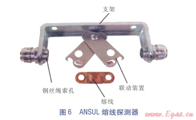④熔線探測器(見圖6)。熔線探測器布置在保護(hù)區(qū)的上方,通過額定溫度的合金熔線進(jìn)行自動探測,當(dāng)溫度超過額定溫度時,熔線斷開,鋼絲繩索松開。其安裝圖見圖7。
