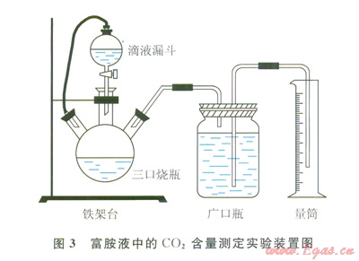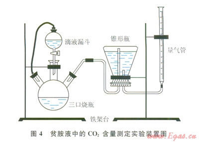 圖3、4分別為富胺液、貧胺液中的CO2含量檢測(cè)裝置,胺液樣品中CO2含量使用酸解法測(cè)得坫]。酸解法主要利用強(qiáng)酸置換弱酸的原理,用強(qiáng)酸H2SO4將CO2從胺液中置換出來,通過測(cè)定放出的CO2氣體體積計(jì)算溶液對(duì)CO2的吸收量。