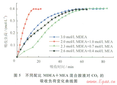 2)MDEA/DEA配比為2.0/1.0時(shí)CO2吸收反應(yīng)很快達(dá)到平衡,但該配比在酸氣負(fù)荷較高的條件下CO2吸收速率較低;MDEA/DEA配比為2.6/0.4的混合胺液較MDEA,一胺液對(duì)CO2的吸收性能并無改善作用;2.3/0.7配比的MDEA+DEA混合胺液對(duì)CO2的吸收負(fù)荷與CO2吸收速率均保持較高水平。