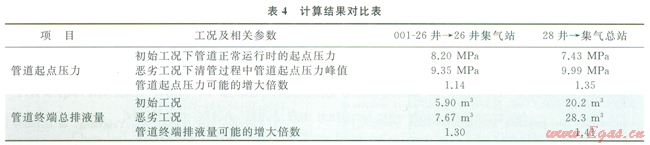 由表4與圖8、9可知,當(dāng)管內(nèi)氣相流速與氣液比均減小時,清管過程中管道的起點壓力峰值和終端排液量均將增大,但不同管道的增大幅度并不一致,體現(xiàn)出的基本規(guī)律為:管道越長或高程差越大,清管中管道的起點壓力峰值和終端排液量增大幅度越大。其中,對管道較長高程差較大的28井®集氣總站管道而言,在管道運行到后期可能遇到的惡劣工況下清管過程中管道起點壓力將比管道運行初期正常運行工況下的起點壓力增大1.35倍,而終端排液量則比管道運行初期清管過程中的排液量增大1.41倍。