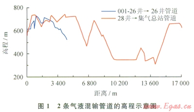 某高含硫氣田各生產(chǎn)井H2S含量的變化范圍為2.15%~2.65%,CO2含量的變化范圍為2.86%~4.03%。選取5個測試井段天然氣組分的平均含量作為原料氣干基組成數(shù)據(jù)(表1)。同時以該高含硫氣田001-26井®26井集氣站和28井®集氣總站這2條氣液混輸管道為例,并結(jié)合這2條管道的現(xiàn)場實際生產(chǎn)數(shù)據(jù),確定相應(yīng)管道清管工況建模參數(shù)如表2所示,2條管道高程如圖1所示。