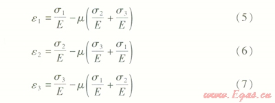 式中e1、e2、e3——三向應力狀態(tài)下3個主應力s1、s2、s3方向的應變
