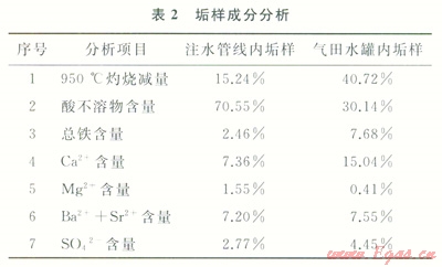 1)碳酸鹽以及硫酸鍶/鋇是造成管線阻塞垢樣的主要成分。當?shù)貙铀诜忾]的集輸管網中輸送時,保持了一定的壓力環(huán)境,進入敞開式的氣田水罐后,罐內壓力遠低于地層水中二氧化碳的分壓,導致二氧化碳氣體逸出,碳酸氫鈣在水中的平衡方程式向有利于生成碳酸鈣垢的方向移動。在結垢過程中,垢晶體吸附周圍環(huán)境的泥砂、腐蝕產物、有機物等物質一起沉積增大,形成無機垢混合物[7-9]。