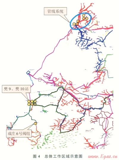 區(qū)塊內(nèi)小型管線系統(tǒng)如圖5所示,共5個測試點(以黃色圓形表示):華固18-2井(單井產(chǎn)氣量為516m3/d)、華固18-3井(單井產(chǎn)氣量為2774m3/d)、樊4集氣站的18號閥組采氣干線、樊4站進口匯管、樊4站出口。
