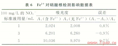 分別按不同比例配制NO3-標(biāo)準(zhǔn)液和Fe3+標(biāo)準(zhǔn)液的混合液,然后根據(jù)標(biāo)準(zhǔn)方法進行硝酸根的檢測,實驗結(jié)果如表5所示。