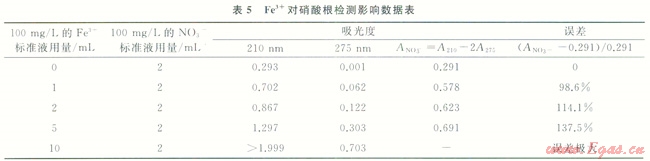 由表5結(jié)果表明:不加Fe3+時,NO3-標(biāo)準(zhǔn)液因不含有機物,在275nm處幾乎無吸收,加入Fe3+標(biāo)準(zhǔn)液后,溶液在210nm、275nm處吸光度明顯提高,這說明Fe3+在210nm、275nm處均有強烈吸收,對NO3-的測定結(jié)果影響較大,能使測定結(jié)果大大增加。