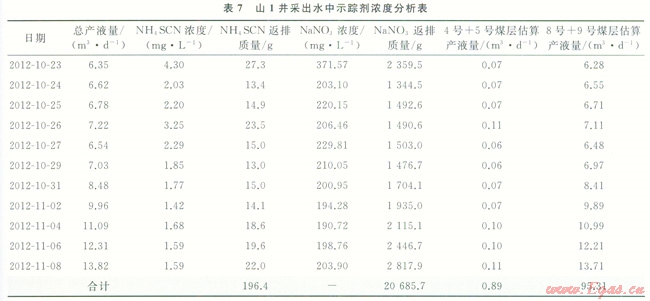 2012年5月對山1井2個層進行了壓裂施工,8號+9號煤層注入壓裂液975.6m3,加入NaNO3 500kg,示蹤劑在單層壓裂液中的平均濃度約為510mg/L;4號+5號煤層注入壓裂液1003.5m3,NH4SCN用量500kg,示蹤劑在單層壓裂液中的平均濃度約為500mg/L。施工完成后,關(guān)井?dāng)U散壓力。油嘴控制排液,無液體返出。同年10月17日進行排采,10月23日開始對采出液進行采樣分析,17d內(nèi)取了11個樣,按照前面實驗室分析方法分析SCN和NO3-(除鐵,扣減SCN吸光度的方法進行修正),采出水中各種示蹤劑的含量如表7數(shù)據(jù)所示。