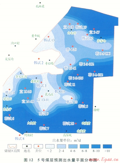 基于煤層氣排采出水量預(yù)測(cè)結(jié)果,編繪了研究區(qū)5號(hào)煤層含水性平面分布特征圖(圖12)。由該圖可知,5號(hào)煤層南部和北部及中部韓3-2-025井區(qū)出水量較大,呈現(xiàn)沿?cái)嗔褞?、?gòu)造低幅度區(qū)及頂?shù)装搴駥由皫r區(qū)出水量增大的趨勢(shì)。