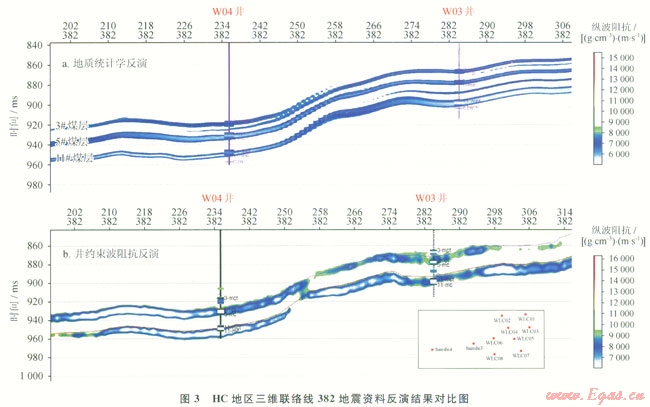 測井曲線分析表明,煤層縱波阻抗明顯低于砂泥巖,因而可以應(yīng)用聲波阻抗反演方法預(yù)測煤層厚度。但由于該區(qū)煤層厚度薄、不同井間厚度變化大,為提高薄煤層分辨能力,在縱波阻抗反演基礎(chǔ)上應(yīng)用地質(zhì)統(tǒng)計(jì)學(xué)反演得到了比較好的效果,從圖3中可以看出地質(zhì)統(tǒng)計(jì)學(xué)反演結(jié)果對(duì)薄煤層(藍(lán)色為雕刻出的煤層)反映特別清晰,與井吻合性更好,由此獲得的煤層厚度預(yù)測平面圖精度更高。