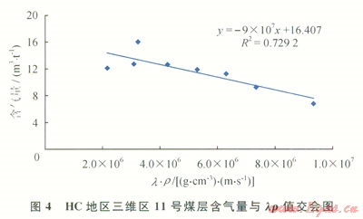 煤層含氣性預(yù)測的基礎(chǔ)是測井曲線分析。通過對(duì)研究區(qū)內(nèi)所收集到的井的含氣量與彈性參數(shù)交會(huì)分析(圖4)得到,該區(qū)11號(hào)煤層的含氣量隨密度、縱波速度、縱橫波速度比、lr值增大而減小,同時(shí)按線性關(guān)系擬合儲(chǔ)層含氣量與lr值之間的數(shù)學(xué)關(guān)系,相關(guān)系數(shù)為0.7292,認(rèn)為兩者的線性關(guān)系有一定的可靠性,可以用lr值來指示含氣量的變化,lr小值對(duì)應(yīng)含氣量的大值。