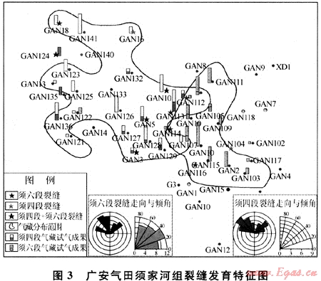 廣安氣田的須六段與須四段儲(chǔ)層總體上裂縫比較發(fā)育,在成像測井圖上[11],整個(gè)廣安構(gòu)造共有13口井發(fā)育裂縫(圖3),須四段與須六段的裂縫發(fā)育特征相似,裂縫走向主要有北西和北東向2組,中低傾角,發(fā)育井位多數(shù)重合,反映其可能在同一應(yīng)力場下形成。其中須六段裂縫主要發(fā)育在下亞段,共有9口井測井時(shí)發(fā)現(xiàn)裂縫,以低角度縫為主,部分發(fā)育水平縫和高角度縫,但氣藏分布范圍內(nèi)只有2口井(廣安105和廣安107井)發(fā)育裂縫,共發(fā)現(xiàn)5條張開裂縫,其余裂縫發(fā)育井均不在探明儲(chǔ)量范圍內(nèi)。因此須六段氣藏的主要儲(chǔ)集空間是孔隙,裂縫不是影響產(chǎn)能的主要因素。