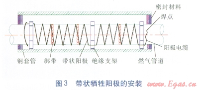 ②不可避免使用套管時,可在套管內(nèi)部采取局部的陰極保護(hù)也是一種很有效的辦法。具體做法是:在套管內(nèi)的主管道上纏繞鎂陽極帶或鋅陽極帶或安裝鐲式陽極[4]。當(dāng)主管道外防腐層為3PE防腐時,推薦使用纏繞鎂陽極帶的局部陰極保護(hù)。安裝鎂陽極帶時,可采用機(jī)械打磨的方法,露出里面的鋼管約3~5cm癌主管道上開鑿一個合適的焊點(diǎn),采用電焊、鋁熱焊等焊接方式把鎂陽極帶一端焊接到主管道上,根據(jù)不同的管徑按照一定的角度和間距,貼著管道的外壁緊緊纏繞。針對不同管徑,鎂陽極帶有不同的纏繞角度:當(dāng)燃?xì)夤艿劳鈴?le;219mm時,鎂陽極帶沿管道外壁等距且與管道軸向成30°角纏繞;當(dāng)燃?xì)夤艿劳鈴綖?span lang="EN-US">219~377mm時,沿管道外壁等距且與管道軸向成45°角纏繞;當(dāng)燃?xì)夤艿劳鈴?ge;377mm時,沿管道外壁等距且與管道軸向成600角纏繞[4]。鎂陽極帶另一端也要和起點(diǎn)一樣,焊接在主管道上,而且兩個焊點(diǎn)都要做好絕緣防腐。鎂陽極帶纏繞施工完畢,套管兩端應(yīng)采用柔性的防腐、防水材料密封,并保證密封良好,防止水或其他雜物的進(jìn)入。纏繞鎂陽極帶法的優(yōu)點(diǎn)是施工簡單方便,缺點(diǎn)是鎂的電位較負(fù),保護(hù)年限不是很長[4]。帶狀犧牲陽極的安裝見圖3。